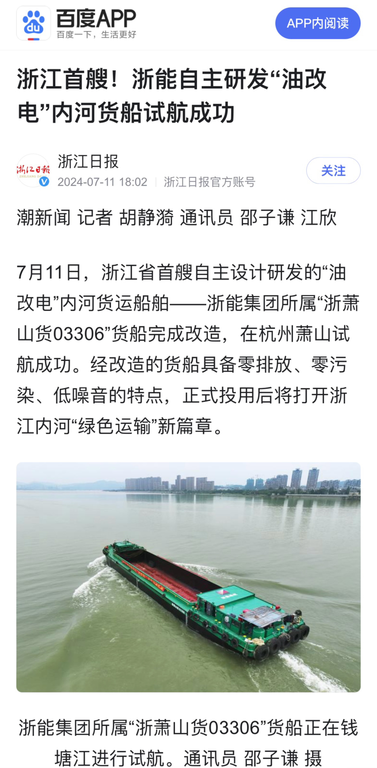 7月11日,百度報道《浙能集團自研“油改電”內河貨船試航成功》。 百度 圖
