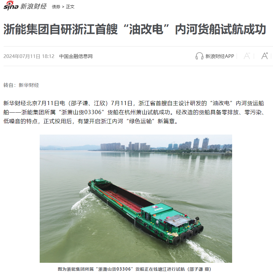7月12日,新浪財經轉載報道《浙能集團自研“油改電”內河貨船試航成功》。 新浪財經 圖