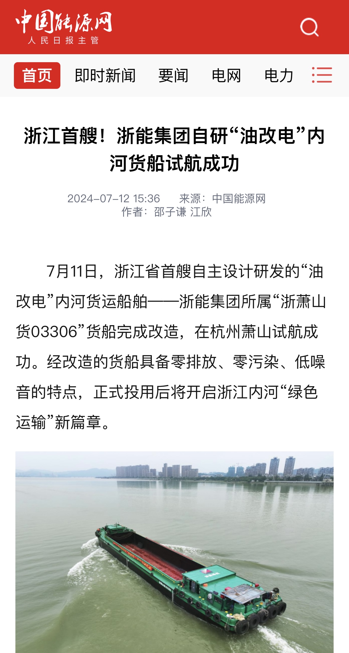 7月12日,中國能源網報道《浙能集團自研“油改電”內河貨船試航成功》。 中國能源網 圖