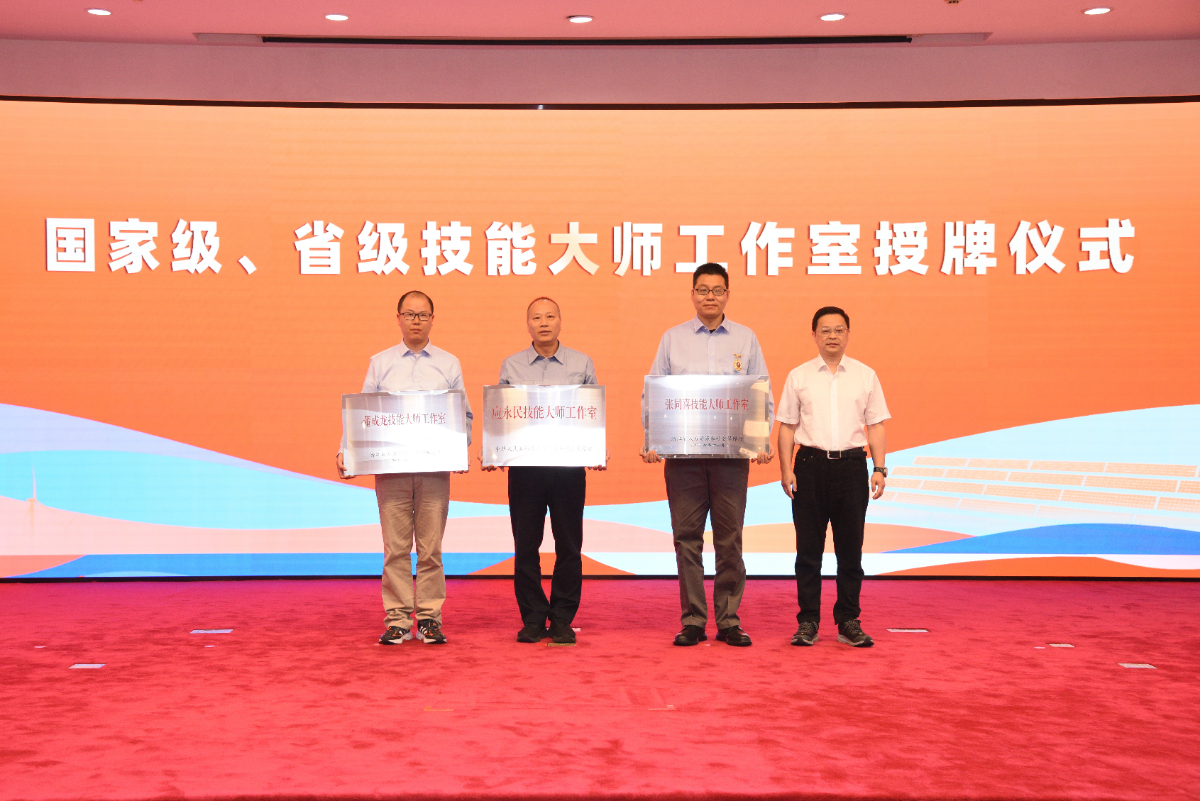 倪震為國家級技能大師工作室領辦人應永民,省級技能大師工作室領辦人張同喜、董成龍授牌。 祝益軍 攝