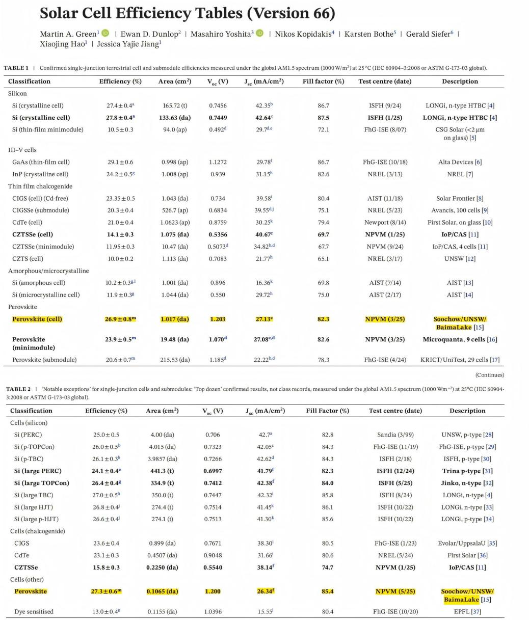 《太陽能電池效率表》(第66版)部分截圖。 羅漪 提供