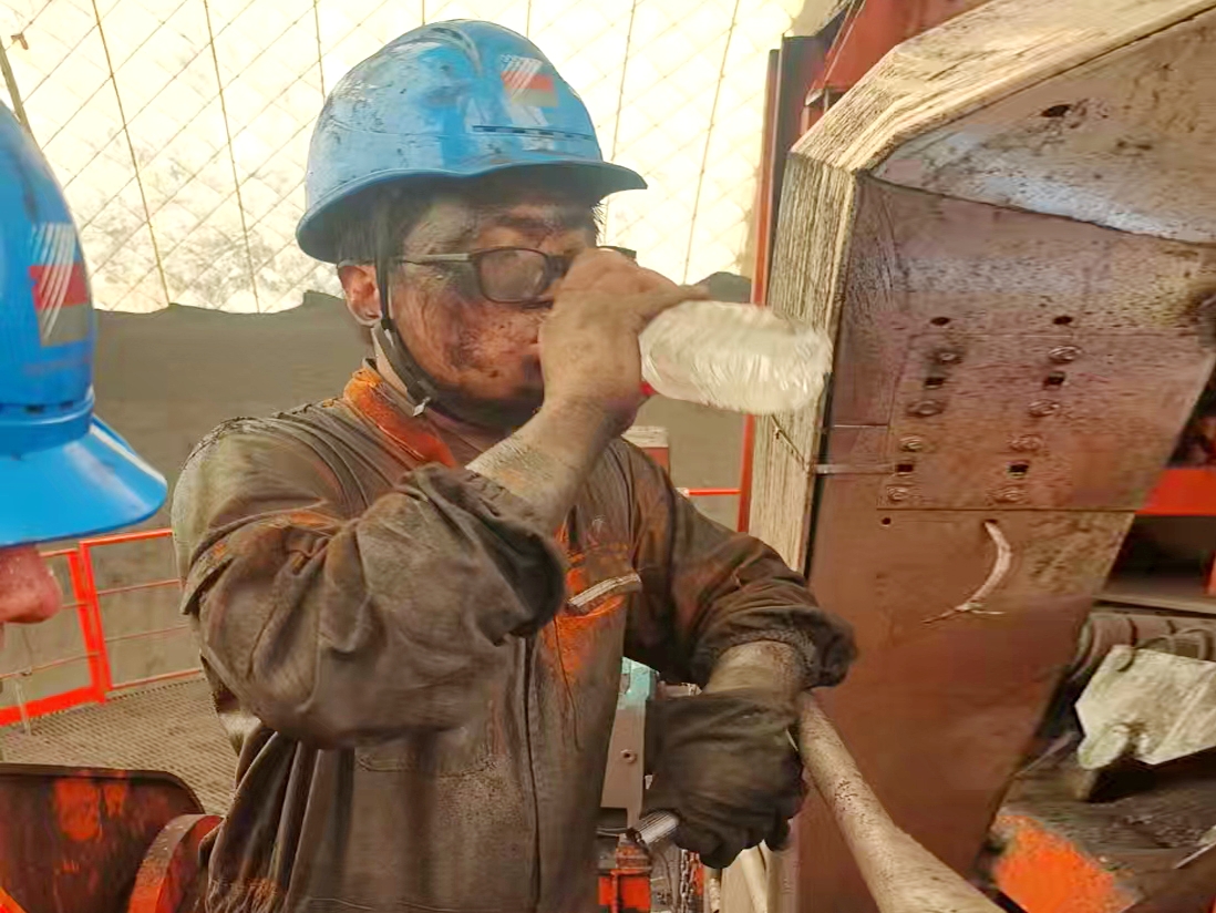 滿身煤泥的檢修人員正在檢修間隙補充水分。 潘黎明 攝