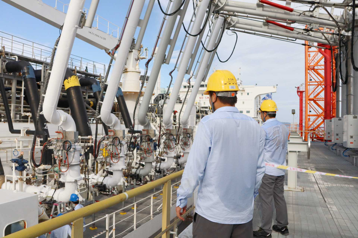烈日下,溫州LNG公司操作監(jiān)督組成員為接船作業(yè)提供岸上協(xié)作與監(jiān)護(hù)支持。 謝晨瀅 攝