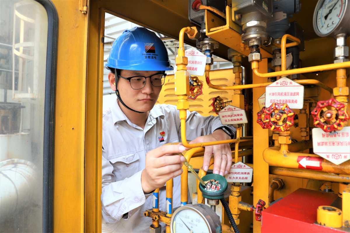 浙能溫電黨員黃永杰在精細(xì)檢查設(shè)備運(yùn)行狀況。 李永輝 攝