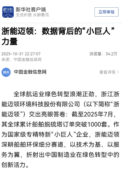 全球航運業(yè)綠色轉(zhuǎn)型浪潮正勁,浙江浙能邁領(lǐng)環(huán)境科技股份有限公司(以下簡稱“浙能邁領(lǐng)”)交出亮眼答卷:截至2025年7月,其全球累計船舶脫硫塔訂單突破1000套。作為國家級專精特新“小巨人”企業(yè),浙能邁領(lǐng)深耕船舶環(huán)保細分賽道,以技術(shù)為基、以服務為翼,折射出中國制造業(yè)在綠色轉(zhuǎn)型中的創(chuàng)新活力。
