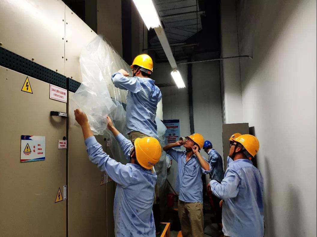 8月10日凌晨,臺風登陸后,舟電公司主廠房受暴雨影響出現漏雨點、積水現象越來越多。當夜,舟電公司立即安排防臺突擊隊、搶險待命小組趕赴現場連夜搶險,大家抓重點、找源頭、堵漏點,包雨布、扛沙袋、搭雨棚,連續奮戰幾個小時,有力保障配電間、UPS室、電子室等區域設備的穩定運行。(文:鄒咪咪,圖:張效銘)