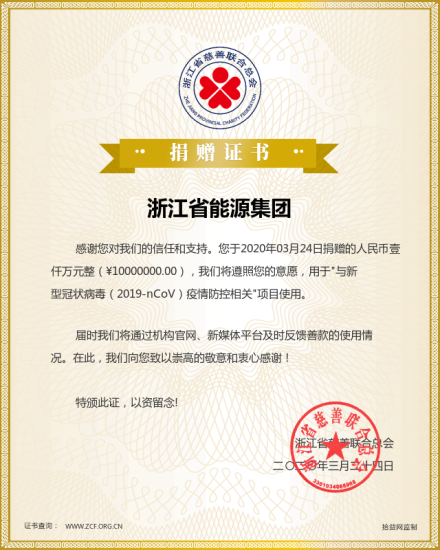 3月24日,浙能集團(tuán)收到浙江省慈善聯(lián)合總會(huì)頒發(fā)的捐贈(zèng)證書(shū),集團(tuán)作為首個(gè)響應(yīng)浙江省慈善聯(lián)合總會(huì)的省屬企業(yè),所屬10家企業(yè)共向浙江省慈善聯(lián)合總會(huì)捐款1000萬(wàn)元。