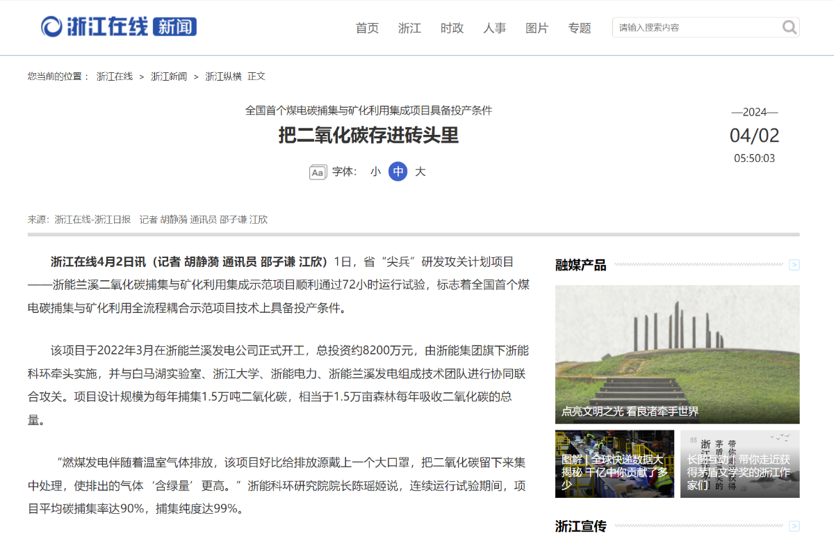 4月2日,浙江在線報道《全國首個煤電碳捕集與礦化利用集成項目具備投產條件 把二氧化碳存進磚頭里》。 浙江在線 圖