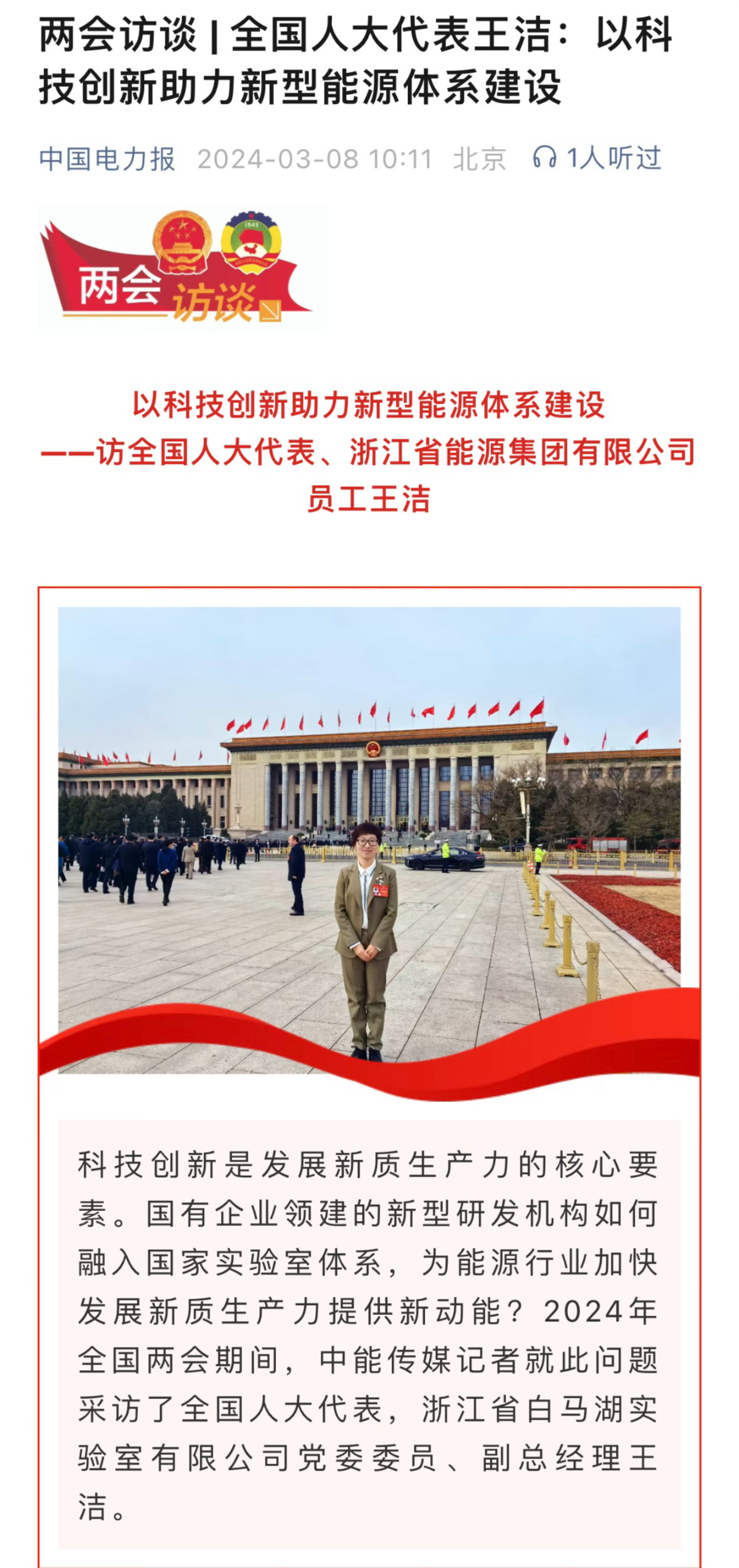 中國電力報報道《兩會訪談 | 全國人大代表王潔:以科技創(chuàng)新助力新型能源體系建設》。 中國電力報 圖