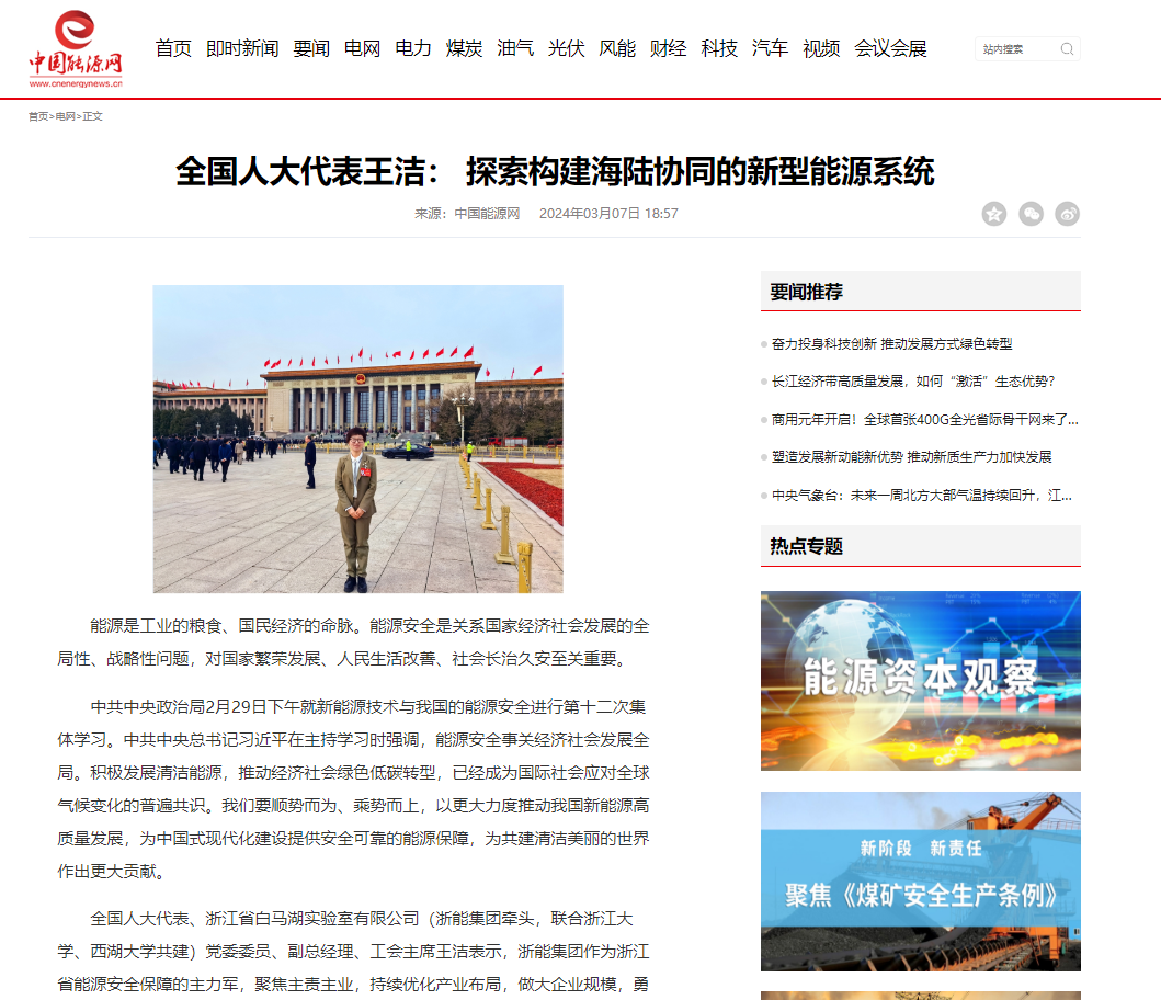 潮新聞客戶端報道《全國人大代表、浙能集團王潔:走好能源清潔低碳轉型之路 推進構建新型能源體系》。 潮新聞客戶端 圖