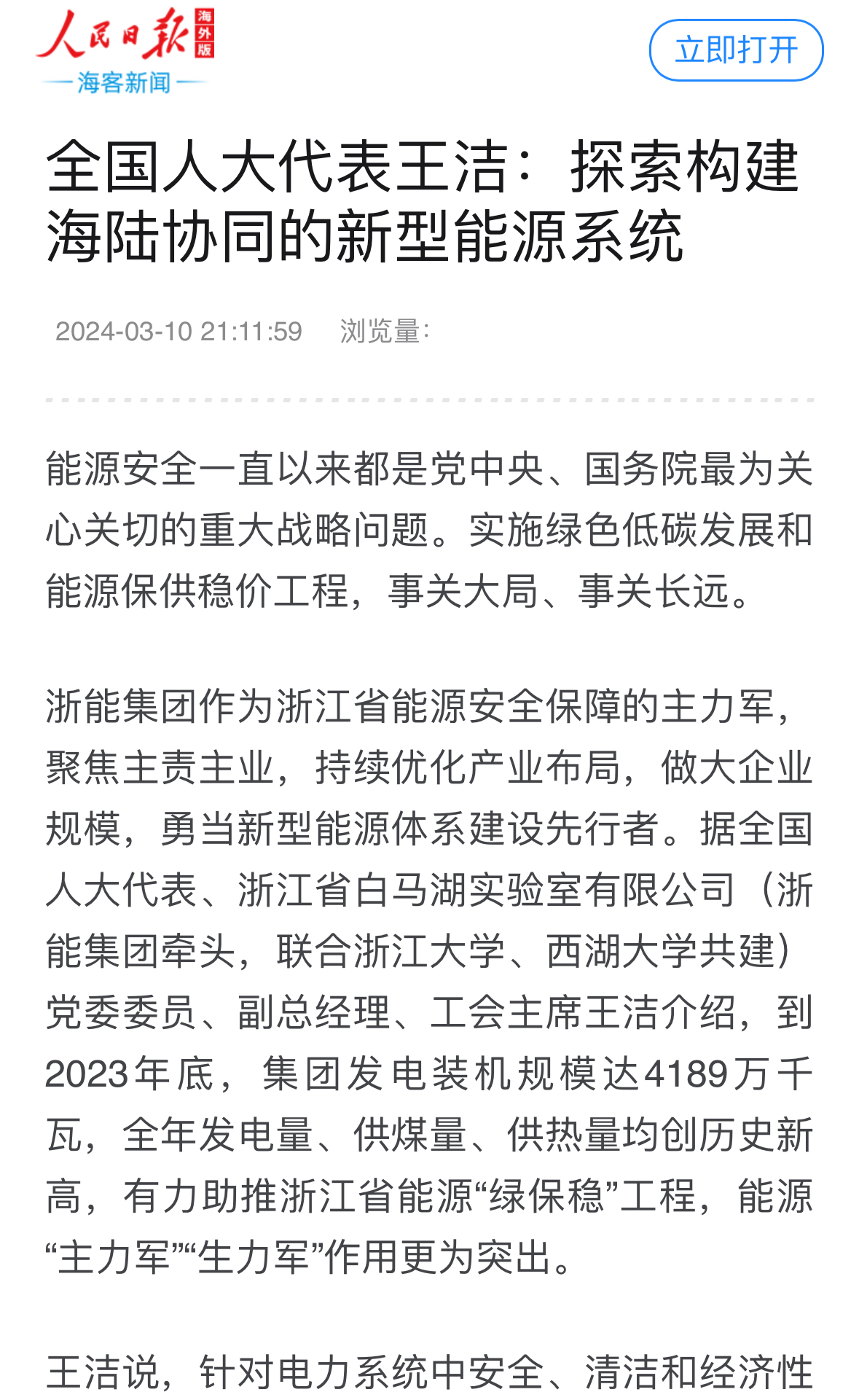 人民日報海外版官網報道《全國人大代表王潔:探索構建海陸協同的新型能源系統》。 人民日報海外版官網 圖