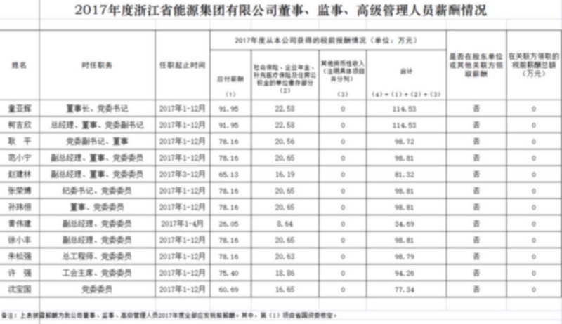 2017年度浙江省能源集團有限公司董事、監事、高級管理人員薪酬情況